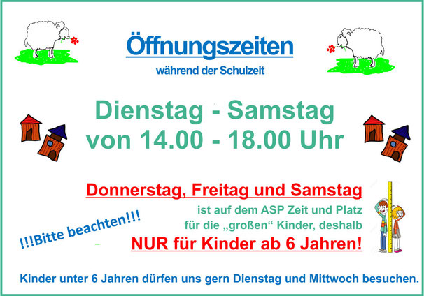 Aufsicht: Kinder unter 6 Jahren müssen bei jedem Schritt vom begleitenden Erwachsenen im Auge behalten werden. Kinder ab 6 Jahre dürfen den ASP allein besuchen. Wir übernehmen keine Aufsichtspflicht, helfen aber natürlich immer, wenn es nötig ist.